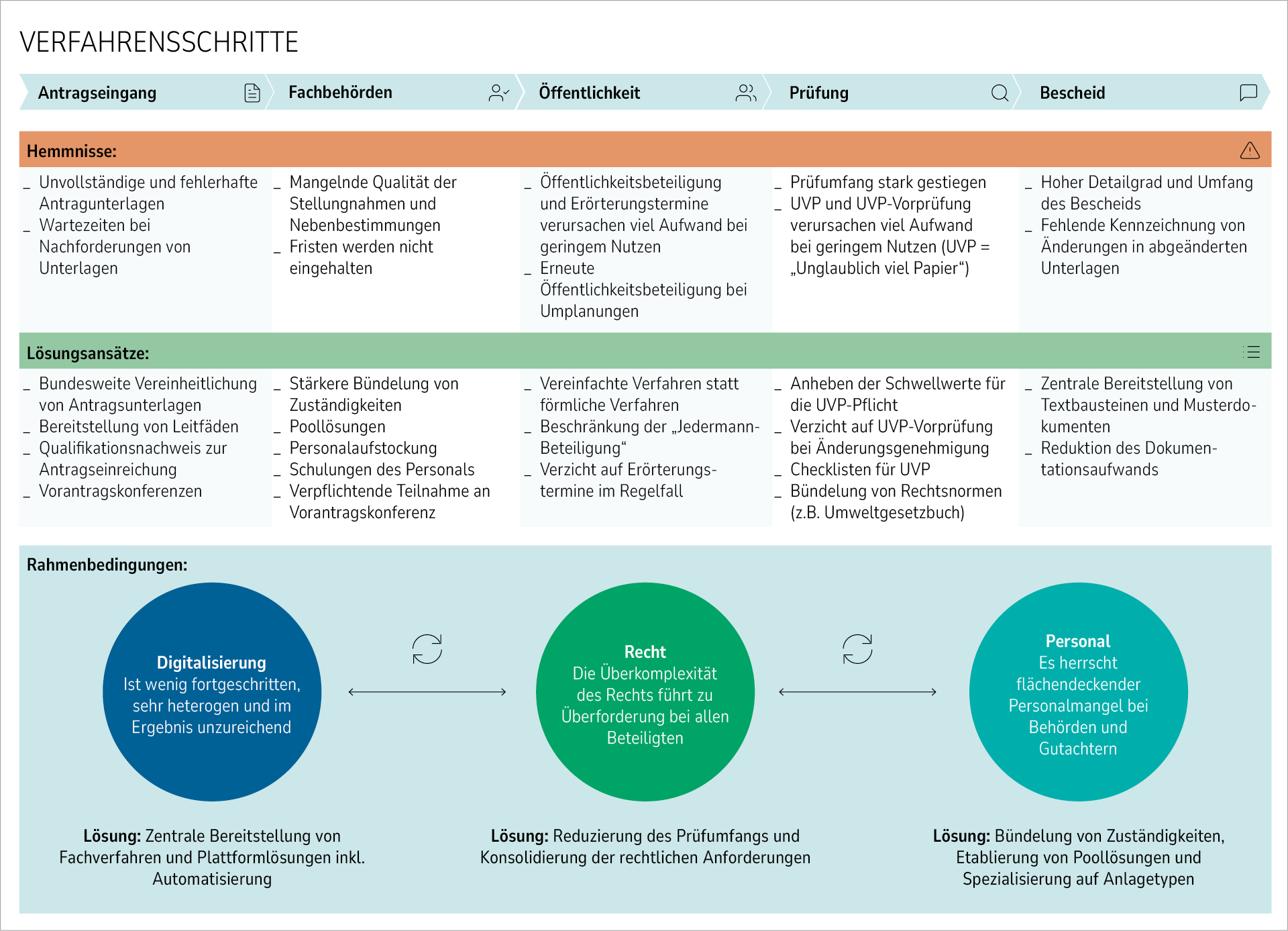 Zudem wünschen sich viele Befragte verbesserte Rahmenbedingungen, um die Verfahren effizienter durchführen zu können. Dazu gehören zentrale Plattformlösungen als Teil der Prozessdigitalisierung, Konsolidierung der rechtlichen Anforderungen und die Etablierung von Poollösungen und Spezialisierung auf Anlagetypen innerhalb der Behörden.
