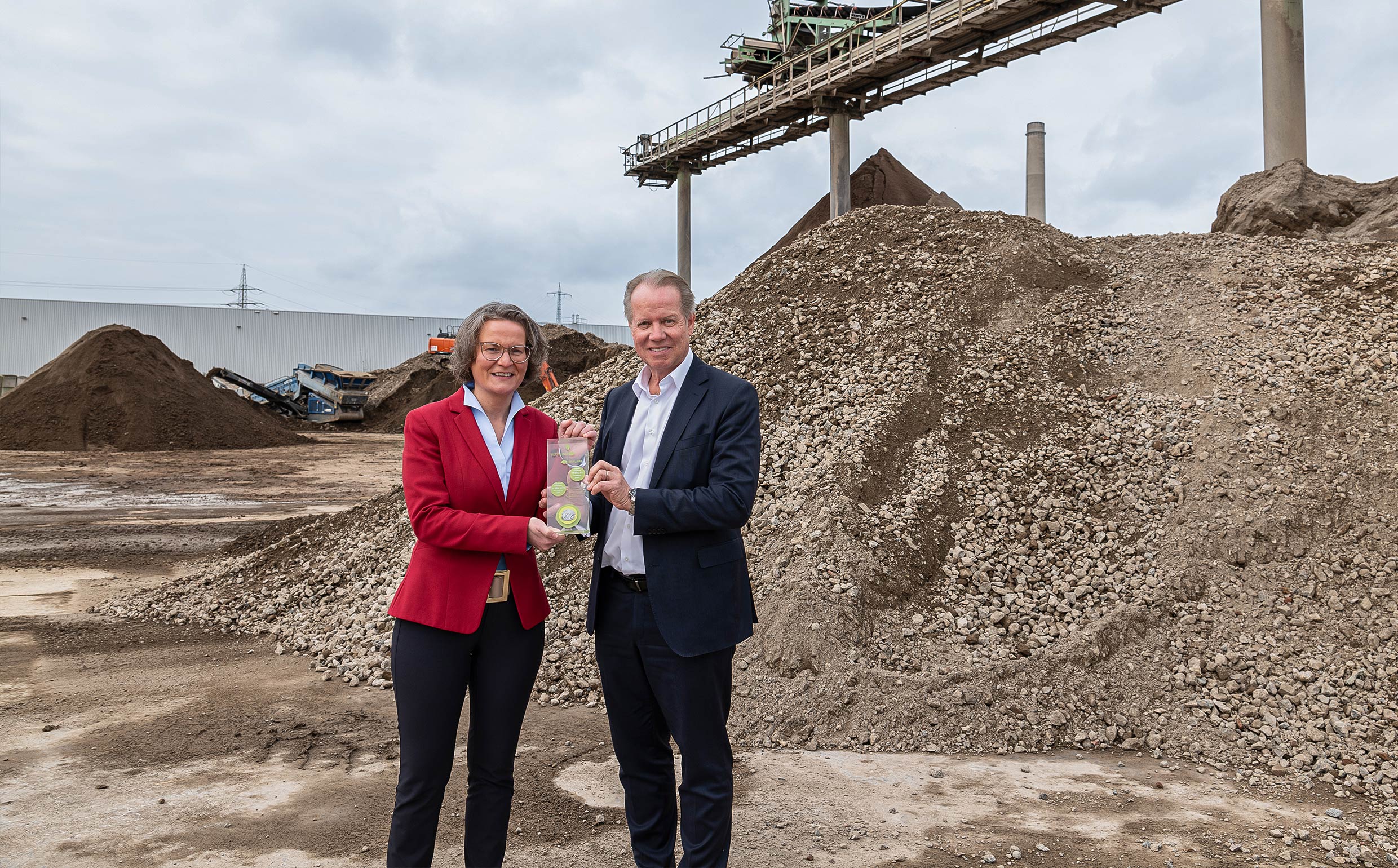 Pressefoto vom Termin: Auf dem Weg zur Ressourcenwende: REMEX-Geschäftsführer Michael Stoll mit NRW-Bauministerin Ina Scharrenbach auf einer Baustoffrecyclinganlage in Düsseldorf (Foto: REMEX GmbH)