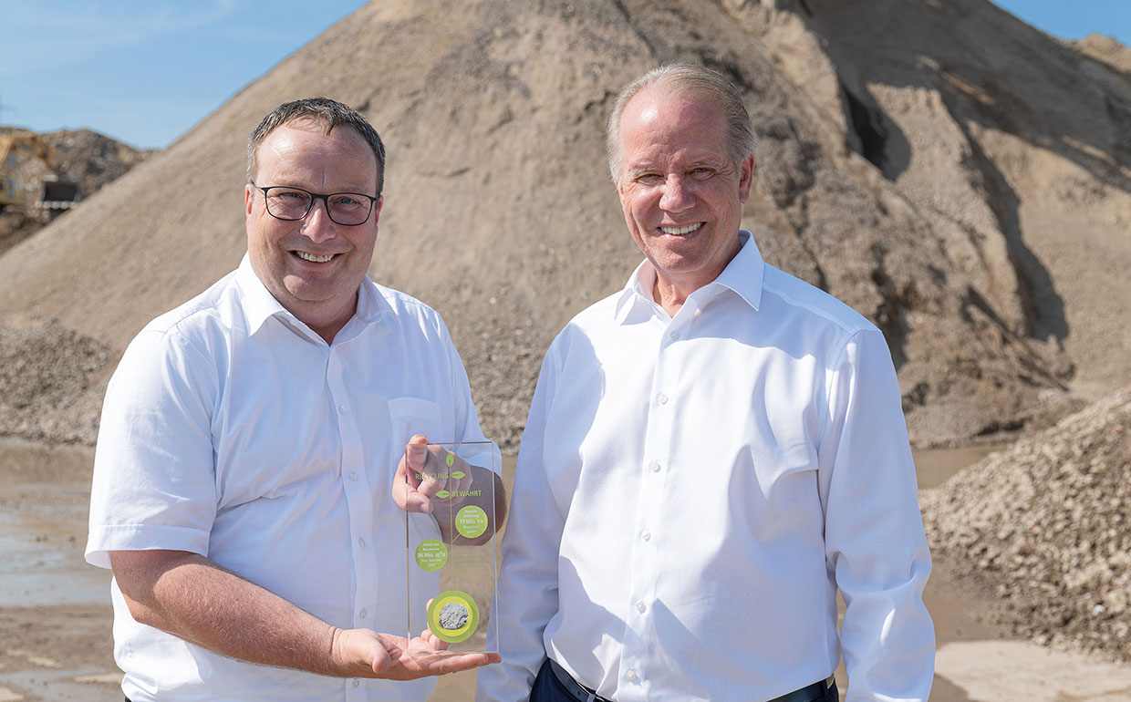 Pressefoto vom Termin: NRW-Umweltminister Oliver Krischer und REMEX-Geschäftsführer Michael Stoll: In der REMEX-Recyclinganlage werden aus Boden und Bauschutt güteüberwachte Recyclingbaustoffe hergestellt, deren Nutzung im Tiefbau seit Jahrzehnten etabliert ist. Ein Teil dieser Recyclingbaustoffe könnte problemlos auch im Hochbau eingesetzt werden.