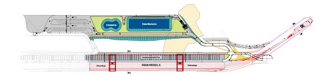 HGK-Containerterminal: Logistik setzt auf Recyclingbaustoffe![]() Seit dem Frühjahr 2018 wird im Rahmen einer vom Bund geförderten Maßnahme im Auftrag der > Häfen- und Güterverkehr Köln AG (HGK) der Bau der Erweiterung des Containerterminals Nord in Köln realisiert. Bereits im Jahr 2015 wurde das erste Modul des damals neuen Terminals in Betrieb genommen. Die Erweiterung sieht die Verlängerung der nutzbaren Gleise auf 700 Meter vor. Auftragnehmer der HGK für die zweite Bauphase ist die ARGE KV-Nord A2, die sich aus den zwei Unternehmen > Heinz Schnorpfeil Bau GmbH sowie der > GBM Gleisbau Maas GmbH zusammensetzt. Oberbauleiter Fabian Kronenberger: „Die Umsetzung erfolgt bei laufendem Betrieb des bereits existierenden Teils des KV-Terminals. Die Besonderheit dieses Projekts sind die extrem hohen Anforderungen an den Untergrund. Es müssen die Schwerlasten, die durch die zukünftige Containerbe- und -entladung von ca. zehn Zügen pro Tag entstehen werden, sicher abgetragen werden. Das spiegelt sich auch im Leistungsverzeichnis wider: die mengenmäßig größte Auftragsposition ist der Erdbau mit Massenbewegungen von rund 64.000 m3.“ ![]() Grafik: Vereinfachter Ausschnitt des Lageplans