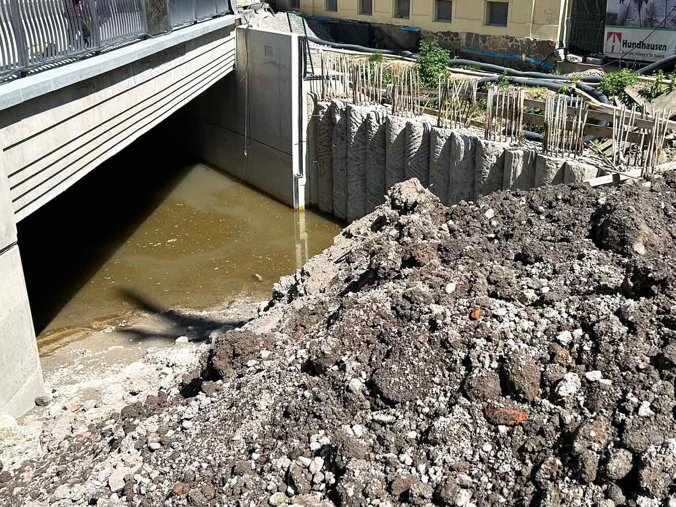 Die Wasserbauarbeiten für den 120 m langen und 7,5 m breiten Grabenabschnitt verantwortet die Hundhausen-Bau GmbH, Niederlassung Erzgebirge. Sie hat die REMEX mit der Entsorgung des gesamten Aushubs beauftragt. Die Materialien, die unser Leipziger Team abfährt, müssen mit Kalk und Füllkies in situ stabilisiert werden, um sie transportfähig zu machen. Insgesamt wurden bisher über 14.000 t Boden und knapp 1000 t Beton von REMEX mit einer Klassifizierung als DK-I- bzw. Z-2-Material abgefahren. In Anbetracht der beengten Platzsituation inmitten eines Wohngebietes mit angrenzender Schule eine beeindruckende logistische Leistung.