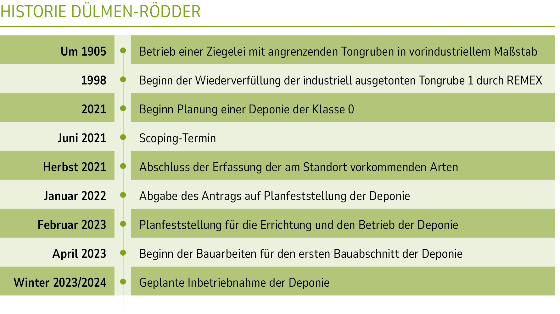 Um die Ablagerung von Inertabfällen in Dülmen zu ermöglichen, hat sich REMEX entschlossen, den Bau und Betrieb einer DK-0-Deponie als Folgenutzung der Tongrubenverfüllung zu planen und zu beantragen. Das im März dieses Jahres genehmigte Deponievolumen beträgt 960.000 m³. Bei einer jährlichen Verfüllmenge von 72.000 t beläuft sich damit der Verfüllzeitraum auf rund 20 Jahre.