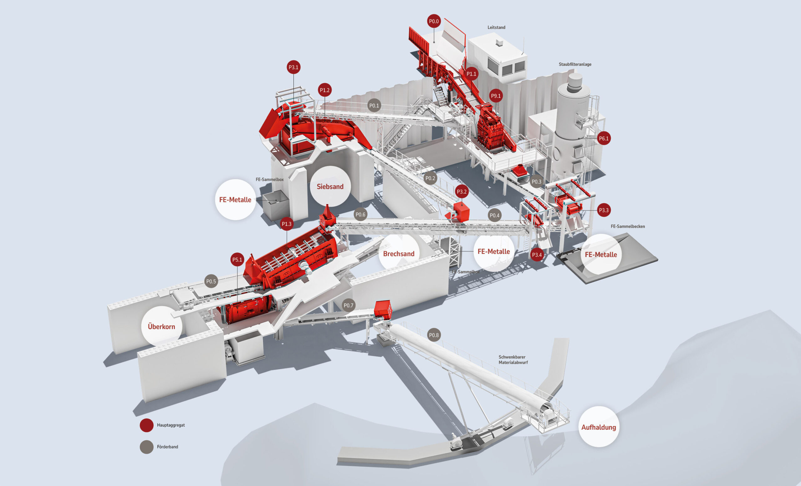 Die Umsetzung sieht eine vollständige Erneuerung der bestehenden Aufbereitungsanlage vor. Dabei werden zentrale Komponenten wie Prallbrecher, Siebanlagen und Windsichter neu errichtet, um eine präzise Trennung der Materialfraktionen zu gewährleisten. Ergänzt wird die Anlage durch eine leistungsstarke Staubfilteranlage, moderne Magnetabscheider und automatisierte Schmier- und Wiegesysteme – für einen zuverlässigen und umweltfreundlichen Betrieb.