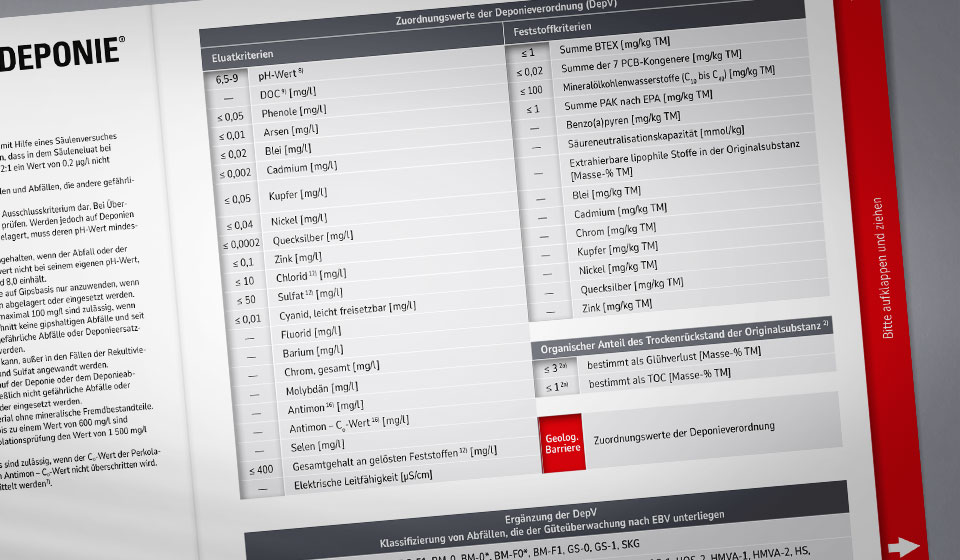 Im Zuge der grundlegenden Charakterisierung vor der Anlieferung zur Deponie müssen Abfälle analysiert und einer Deponieklasse zugewiesen werden. Der Schieber zeigt die relevanten Werte der Deponieverordnung auf der Innenseite. Auch Abfälle, die nach der Ersatzbaustoffverordnung (EBV) geprüft sind, können zugeordnet werden – hilfreich in den Fällen, in denen eine Verwertung in technischen Bauwerken nach EBV nicht möglich ist.