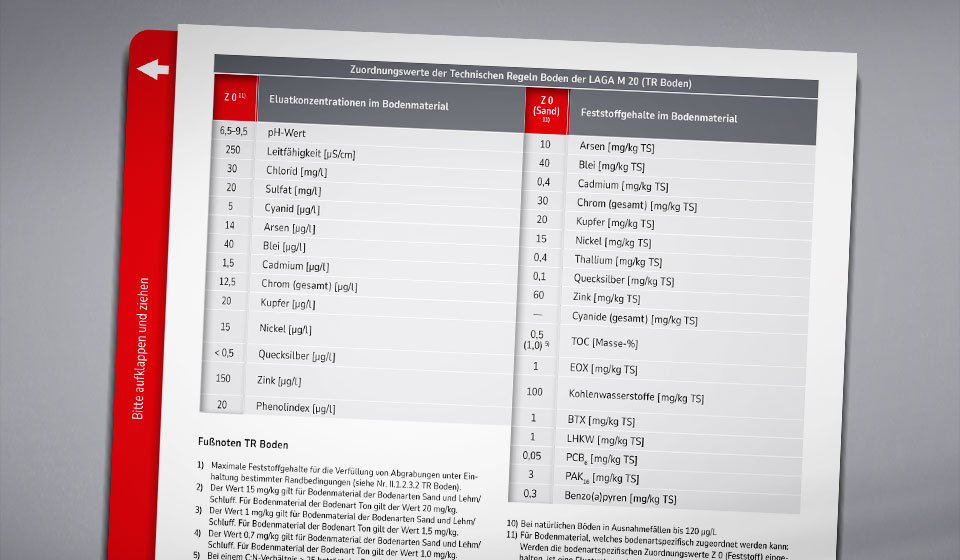 Auf der Rückseite sind die Werte der LAGA M20 (Technische Regeln Boden) abgebildet. Sie sind entscheidend für die Bewertung, ob mineralische Abfälle zum Beispiel in nach LAGA genehmigten Verfüllmaßnahmen/technischen Bauwerken verwertet werden können. Die Werte reichen von Z 0 bis Z 2 und sind nach den Bodenarten Sand, Lehm/Schluff und Ton aufgeschlüsselt.